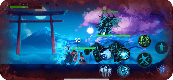 Điều khiển nhân vật ninja bằng các nút ảo trực quan: chém thường, kỹ năng, lướt né.